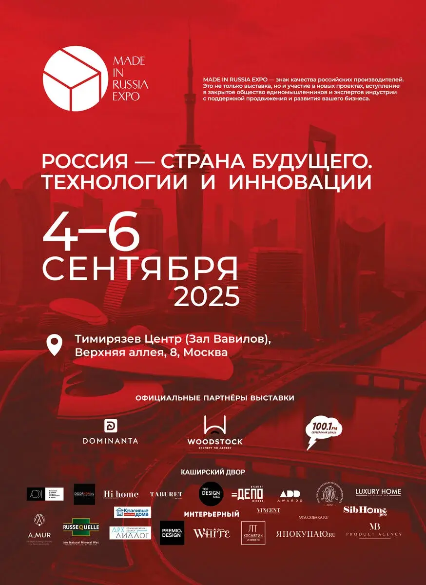 Приглашаем на главное событие года в мире дизайна и инноваций — выставку Made in Russia Expo 2025, которая пройдет с 4 по 6 сентября в инновационном Тимирязев Центре Москвы (Зал Вавилов).